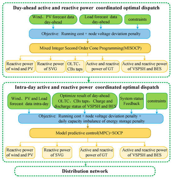 Considering the above, the purpose of this study is to coordinate the active power and reactive power resources including VSPSH of the distribution network, to achieve the lowest operation cost and the minimum node voltage deviation of the distribution network, proposing a multi-time scale optimal dispatch method based on model predictive control. The proposed method includes two stages: day-ahead dispatch and intra-day rolling dispatch. The intra-day rolling dispatch adopts model predictive control, rolling updates the forecast information of wind, PV, and load, and feedback on the actual state of the system for optimization.
