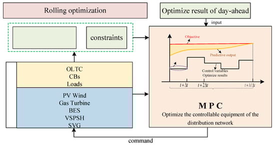 In the day-ahead optimization stage, the optimal dispatch of the distribution network is based on the day-ahead forecast data of wind and solar loads. Due to the long time scale, the forecast error is large in the day-ahead stage, leading to deviations in the optimization results. This paper employs the MPC optimization method to perform rolling optimization of controllable resources in the distribution network every 15 min, enabling intra-day rolling optimal dispatch. The framework for intra-day rolling optimal dispatch is illustrated in Figure 2.