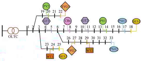 The modified IEEE33 node system is used as an arithmetic example in this paper. The IEEE33 node system is accessed to wind turbines, PVs, gas turbines, VSPSH, BES, CBs, and SVG, with the access locations and capacities as shown in Table 1, and the system structural topology as shown in Figure 3.