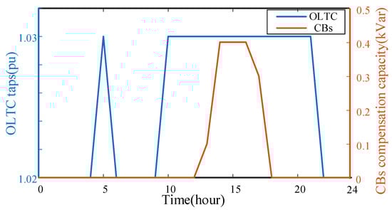 After applying the day-ahead optimization model proposed in this paper, the states and outputs of each controllable resource in the distribution network in a day were obtained. From these results, it can be seen that each controllable resource has a reasonable output. The day-ahead optimization results can serve as the basic dispatching command for the distribution network in a day, ensuring the safe and economic operation of the distribution network. Then, during the intra-day phase, these values will be adjusted on a smaller time scale to account for the variability of renewable energy.