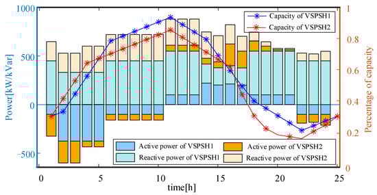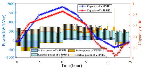 Active power and reactive power outputs and capacity ratio of the two VSPSHS.