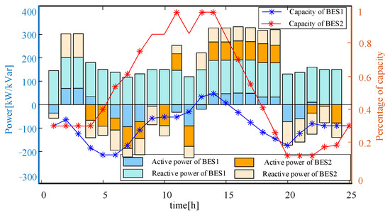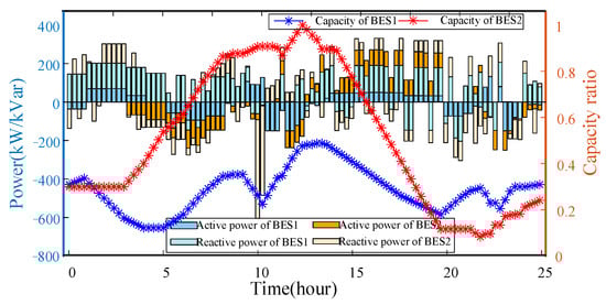 Intra-day variations of active power and reactive power and capacity ratio for BESs every 15 min under Method 1.