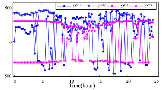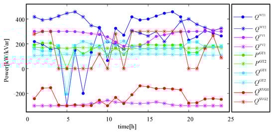Reactive power of WT, PV, SVG and GT and the active power of GT.