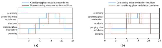 The optimization results of VSPSH operation conditions considering or not considering generating/pumping phase modulation conditions at the day-ahead stage: (a) VSPSH1 operation condition; (b) VSPSH2 operation condition.
