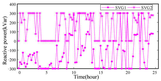 Figure 11 and Figure 12 show the intra-day variations of active power and reactive power and capacity ratio for VSPSHs and BES units under Method 1 every 15 min. We observed from the figure, VSPSH1, VSPSH2 and BES1 can well ensure the daily operating capacity balance during the intra-day period, while the capacity of BES2 at the end of the day is slightly lower than the initial value, primarily due to significant active power fluctuations from wind and fewer controllable resources on that branch. Figure 13 shows the intra-day reactive power of wind and PV under Method 1. The reactive power of wind exhibits significant fluctuations, while the reactive power of PV is relatively small. This is mainly because wind active power fluctuates throughout the 24 h period, affecting the limits of wind reactive power and the reactive power demand on the branch. In contrast, PV active power fluctuates minimally during the night, almost reaching zero, leading to relatively stable reactive power ability. Figure 14 presents the intra-day reactive power of two SVG under Method 1. We observed that SVG1 experiences frequent fluctuations, while SVG2 exhibits larger amplitude variations.