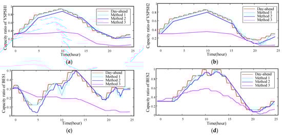 The change of VSPSH and BES capacity ratio under different methods at intra-day stage: (a) VSPSH1; (b) VSPSH2; (c) BES1; (d) BES2.