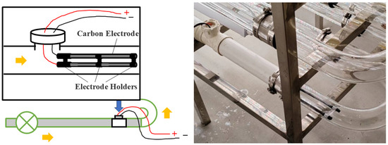 The photobioreactor system was modified to apply different intensities of direct current stimulation via external power supplies (Figure 2). A pair of carbon rods were secured with three PLA connectors, fixing the distance between the electrodes at 2 cm. One end of each rod was connected to the positive and negative leads, insulated with two layers of heat-shrink tubing. After the system was inoculated and circulated via the electric pump, electrical stimulation of 0–3 V was applied for the duration of one circulation cycle.