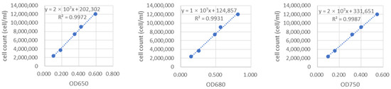 To determine the cell density of microalgae, this experiment conducted counts of microalgae suspensions at different concentrations under an optical microscope using a hemocytometer method, and measured the corresponding optical density values with a spectrophotometer, followed by regression analysis. This study fitted density curves for three wavelengths, as shown in Figure 3. The group with the highest R-squared value was selected, and the standard curve for cell density of N. closterium f. minutissima at 750 nm was obtained as follows: