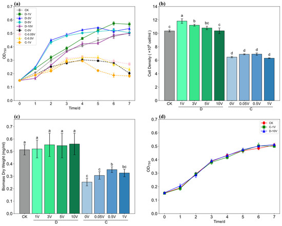Growth curves (n = 3, p < 0.05) (a), maximum cell density with significant differences indicated by different letters (b), biomass with significant differences indicated by different letters (c), and medium treatment experiments (n = 3, p > 0.05) (d) under different modes and voltages of direct current (DC) stimulation, where ‘D’ represents short-term DC stimulation and ‘C’ represents continuous DC stimulation.