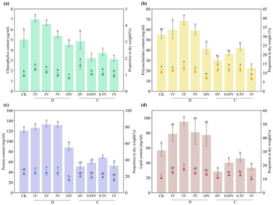 Contents and proportion in biomass dry weight of chlorophyll-α (a), polysaccharide (b), protein (c), and lipid (d) in N. closterium f. minutissima under DC stimulation. Different letters indicate significant differences among treatments. The column in each subfigure represents the nutrient content, and the triangle represents the proportion of each nutrient in the microalgae biomass.