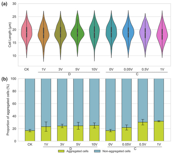 Violin plot of cell size of N. closterium f. minutissima under direct current (DC) stimulation (a) and column chart of the proportion of aggregated cells (b) in N. closterium f. minutissima.