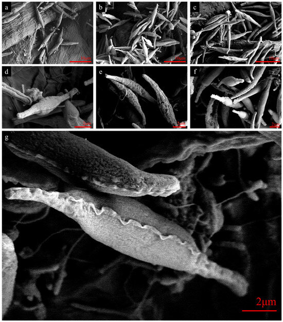 SEM images of N. closterium f. minutissima cells: (a) non-direct current (DC) stimulation overview; (b) 1 V-1d DC stimulation overview; (c) 10 V-5S DC stimulation overview; (d) non-DC stimulation close-up; (e) 1 V-1d DC stimulation close-up; (f) 10 V-5S DC stimulation close-up; an extra close-up of the wavy folds at the seam of N. closterium f. minutissima (g).