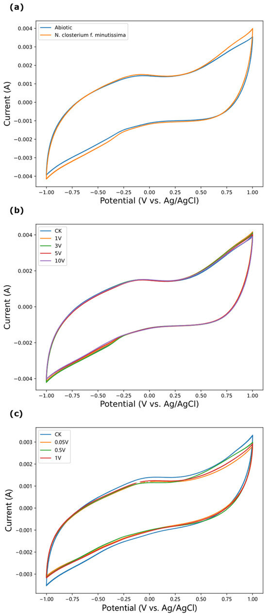 Cyclic voltammetry (CV) curves before and after inoculation with culture medium (a), CV curves of N. closterium f. minutissima under different voltages of short-term (b) and continuous (c) DC stimulation.