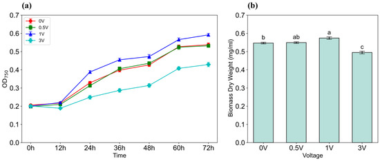Growth curve (n = 3, p < 0.05) (a) and biomass dry weight (b) of N. closterium f. minutissima under direct current (DC) stimulation at different voltages in photobioreactors. Different letters indicate significant differences among treatments. (Note: The horizontal axis of the growth curve here is in hours instead of days.).