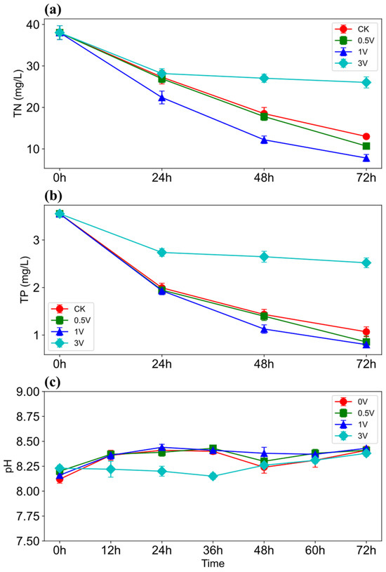 Changes in total nitrogen (TN) (n = 3, p < 0.05) (a), total phosphorus (TP) (n = 3, p < 0.05) (b), and pH (n = 3, p < 0.05) (c) in photobioreactors under different voltages of direct current (DC) stimulation.