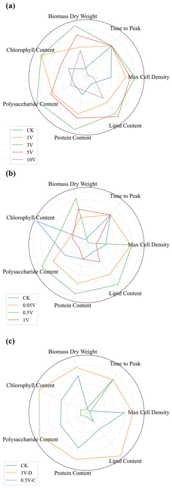 To comprehensively evaluate the optimal voltage for cultivation optimization, Z-score standardization was applied to data across seven dimensions, and a radar chart was generated, with four dimensions representing nutrient levels in the culture. The results indicated that 3 V was the optimal voltage for promoting the growth and nutrient accumulation of Nitzschia closterium f. minutissima under short-term direct current stimulation, as evidenced by a shortened lag phase and a 67.66% increase in lipid content compared to the control group, reaching 94.95 ± 5.66 μg/mL. Polysaccharide and protein contents were also the highest among the short-term electrical stimulation groups (Figure 11a). For continuous direct current stimulation, 0.5 V was the optimal voltage, with a 39.47% increase in biomass dry weight compared to the control group, reaching 0.35 ± 0.02 μg/mL, while polysaccharide, protein, and lipid contents were the highest among the continuous stimulation groups (Figure 11b). By overlaying radar charts for the control group (CK), D-3 V, and C-0.5 V, the area sizes follow the order D-3 V > CK > C-0.5 V (Figure 11c), indicating that 3 V short-term stimulation was the optimal voltage in this study.