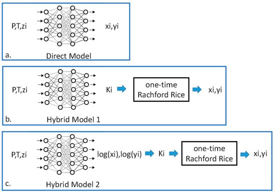 For Hybrid Model 2, we used the neural network to generate and . We then calculated and used one Rachford–Rice iteration. This way, we address the highly nonlinear nature of the variables, large and small values of and , and mass balance consistency between zi, xi, yi, and the vapor–liquid fractions.