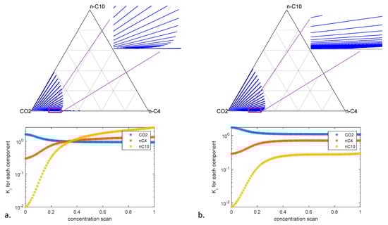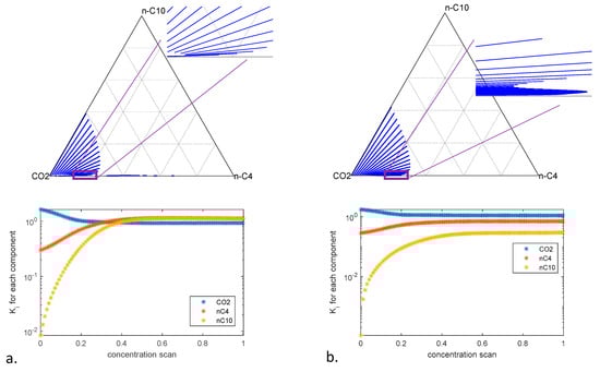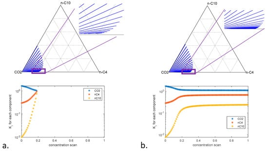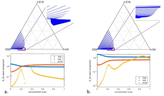 Ternary diagram generated using Hybrid Model 1—Ki → RR → xi, yi: (a) near-critical conditions of 80 atm and 60 °C; and (b) regular conditions of 75 atm and 60 °C.