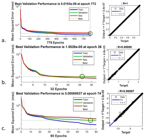 Machine learning (neural network) training, validation, and testing using 4000 flash calculation samples (pressure [80 atm to 40 atm], temperature [57 °C to 67 °C], and overall composition of CO2-C4-C10 [0 to 1]) for (a) Direct Model, (b) Hybrid Model 1, and (c) Hybrid Model 2.