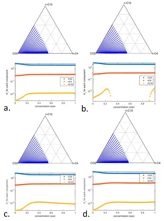 Figure 2 represents the phase behavior and equilibrium constants calculated using the Peng–Robinson equation of state for a CO2, n-butane, and n-decane mixture under two conditions: near-critical and regular. In Figure 2a, the near-critical conditions at 80 atm and 60 °C show the tie-lines becoming shorter and denser, indicating the difficulty of distinguishing between the liquid and vapor phases as the system approaches the critical point. The equilibrium constant Ki approaches one, indicating the critical point. In Figure 2b, under regular conditions at 75 atm and 60 °C, the tie-lines are longer and more evenly spaced, indicating well-defined phase behavior. The equilibrium constant Ki displays smoother transitions across the concentration scan, with CO2 showing higher Ki values at lower concentrations, while n-decane’s heavier nature results in a lower Ki.