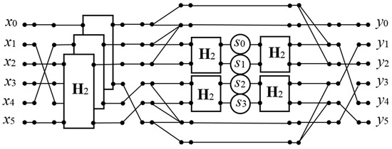 Figure 2 shows a data-flow diagram of the proposed algorithm for the implementation of 3-point QDFT. To improve the readability of the figures, in Figure 2 (and in the other figures), we decided not to write superscripts for the entries and of the diagonal matrix .
