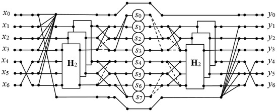 It should be noted that exclusively in this case, the matrix coincides with the second-order Hadamard matrix . The operation of multiplying the second-order Hadamard matrix by a vector of length 2 is the basic operation of most fast algorithms. In some papers, it is called a butterfly [29].