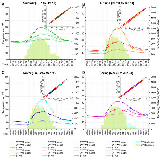 Air temperatures of the Trombe wall’s air cavity during average days of each of the stages of the experiment, roughly corresponding to seasons of the year: (A) 1 July to 10 October, (B) 11 October to 21 January, (C) 22 January to 29 March, (D) 30 March to 30 June. The solid and dashed lines depict the measured and modeled temperatures during the baseline and experimental year (separated by color).The dotted lines depict the outside temperatures recorded during the same season. The areas in yellow and cyan show the solar radiation during both years for reference. Scatterplots in the corner depict the correlations between the model and the measurements with their 95% confidence ellipses.