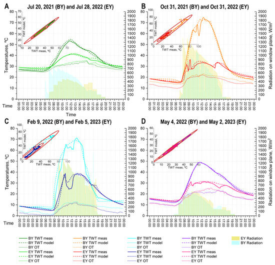 Air temperatures of the Trombe wall’s air cavity during the studied sunny days. The solid and dashed lines depict the measured and modeled temperatures during the baseline and experimental year readings (separated by color) during: (A) 20 July 2021 and 28 July 2022, (B) 31 October 2021 and 31 October 2022, (C) 9 February 2022 and 5 February 2023, (D) 4 May 2022 and 2 May 2023. The dotted lines depict the outside temperatures recorded during the same day. The areas in yellow and cyan show the solar radiation during both years for reference. Scatterplots in the corner depict the correlations between the model and the measurements with their 95% confidence ellipses.
