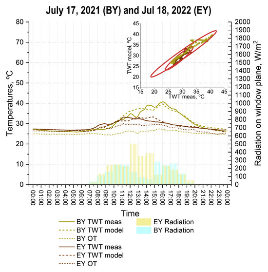 Trombe wall air temperatures during a cloudy day in July. The solid and dashed lines depict the measured and modeled temperatures during the baseline and experimental year (separated by color) days: 17 July 2021 and 18 July 2022. The dotted lines depict the outside temperatures recorded during the same day. . The areas in yellow and cyan show the solar radiation during both years for reference. Scatterplots in the corner depict the correlations between the model and the measurements with their 95% confidence ellipses.