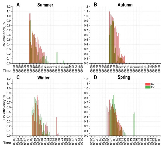 Hourly efficiency trends revealed high values during early morning (7–9 a.m.), with saturation occurring before noon (Figure 6). The system lost the ability to store heat quite quickly due to its limited thermal mass during the BY and EY alike. The secondary spikes observed by the end of the solar day (Figure 6A,C,D) occurred if the system cooled down enough to be able to incorporate any additional heat either after a cloudy moment or due to a change in solar angles.
