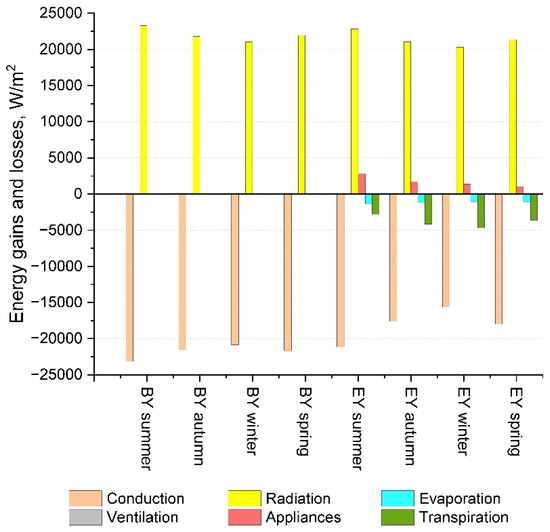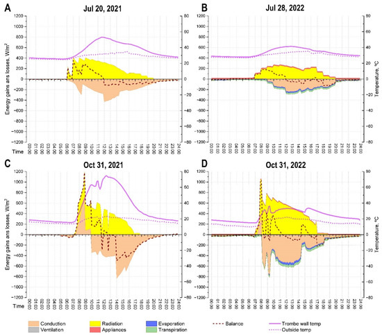 The daily energy balance of the TW was primarily influenced by solar radiation and conduction losses, with ventilation, transpiration, and appliance-related factors playing smaller roles. Conduction losses, strongly correlated with TW air temperatures, were more pronounced at higher temperatures (Figure 7).