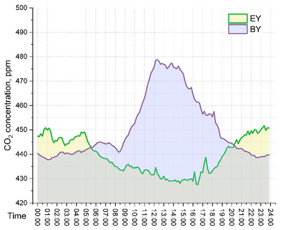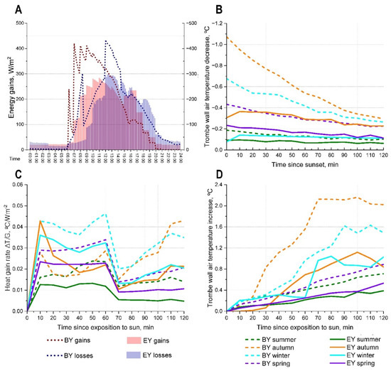 In BY, heat gains followed the solar day closely, while losses continued for 2–3 h post-sunset, with little to no energy exchange after that. In EY, heat gains and losses overlapped more, occurring at slower rates and with reduced magnitudes. This explains the overall lower efficiency readings during the EY (Figure 8A).