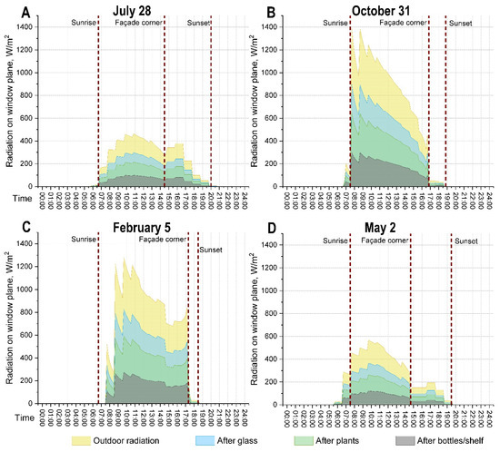 Fractions of solar radiation passing through layers of the green TW during the four studied sunny days: (A) 28 July 2022, (B) 31 October 2022, (C) 5 February 2023, (D) 2 May 2023.
