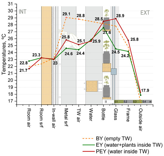 In EY, energy entered the TW cavity more gradually. While 64.5% of incident solar radiation directly interacted with the TW air and surfaces in BY, only 21.5% did so in EY. This was due to additional shading and absorption by the plants’ canopy (18.1%), as well as the shelf surfaces and dark bottles (25%). Consequently, heat remained closer to the glass for longer periods, increasing conductive and radiative losses through the window (Figure 9).