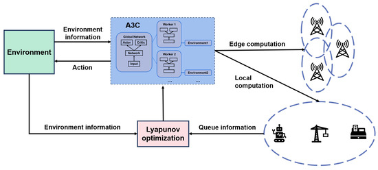 Most existing works take delay or energy consumption minimization as the optimization objective. For example, Ref. [7] employed the double and dueling architectures on the basis of deep Q-network, and proposed the D3QN-based multi-priority computation offloading scheme to minimize overall task delay. Ref. [8] used Lyapunov optimization to decompose the multi-layer multi-timescale resource allocation problem into three sub-problems, and employed a deep actor-critic algorithm to minimize the total queuing delay of all devices. Ref. [9] proposed a multi-agent deep reinforcement learning (MADRL)-based scheduling algorithm, which actor-critic (AC) framework with estimation and target networks is designed for policy and value iterations to minimize delay. Similarly, Ref. [10] proposed multi-agent double actor-critic algorithm to reduce the task processing delay while improving the blockchain transaction throughput. Ref. [11] designed a joint communication and computation resource allocation mechanism based on Q-learning to minimize the total task delay cost. On the other hand, Ref. [12] incorporated a data fusion system in the architecture and designed a joint computation offloading and resource allocation scheme to minimize the overall queuing delay of the system. Ref. [13] designed an algorithm that decomposes the problem into task offloading and channel allocation sub-problems, and proposed a low-complexity heuristic algorithm to solve the sub-problem efficiently for total weighted task processing latency minimization. Ref. [14] developed a novel online SBS peer offloading framework by leveraging the Lyapunov technique, in order to maximize the long-term system performance while keeping the energy consumption of SBSs below individual long-term constraints. Ref. [15] aimed to optimize the average energy consumption by using non-orthogonal multiple access (NOMA) technique to improve the spectral efficiency and access, which is solved using successive convex approximation. Ref. [16] combined NOMA technique and frequency division multiple access and used long short-term memory network to optimize the objective. Ref. [17] used the air-ground integrated computing networks multi-agent deep deterministic policy gradient algorithm to minimize the average energy consumption by jointly optimizing the computation task allocation and wireless resource allocation.