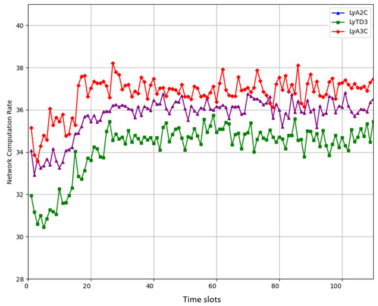 Figure 4 presents a comparative analysis of the network computation rates across various algorithms under identical model conditions. The network computation rates of all algorithms oscillate within a defined range, signifying that each algorithm achieves a relatively stable rate over time. Specifically, TD3-based and A2C-based algorithms record lower long-term network computation rates. Although a temporary intersection exists between the LyA3C and A2C-based algorithms at a specific time, the LyA3C algorithm ultimately outperforms the rest by attaining the highest optimal network computation rate. This superiority is attributed to the LyA3C algorithm’s deployment of multiple parallel agents, which enhances the network computation rate during operation. As time progresses, the fluctuation range diminishes, steadily converging toward the optimal network computation rate.
