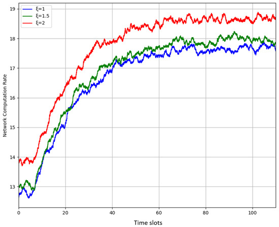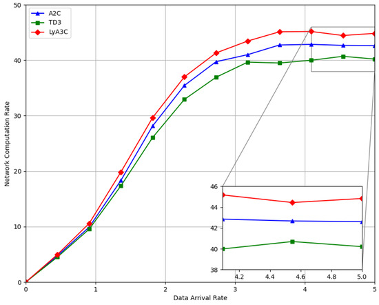 From Figure 5, Obviously, as the data arrival rate increases, the network computation rate exhibits an upward trend. This is because when the data arrival rate is low, the queue is stable in the long term. At this point, the network computation rate is directly proportional to . However, when the data arrival rate is very high, conflicts among resources increase, causing the network computation rate to stop increasing or even decrease.