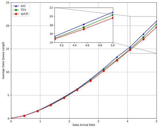 Relationship between data arrival rate and average data queue length for different algorithms.