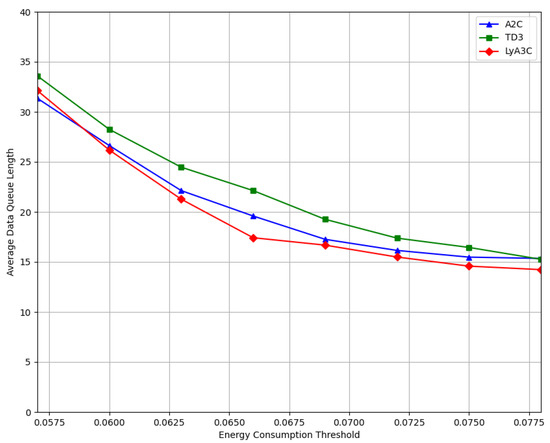 Figure 9 evaluates the changes in task queue length of the three algorithms with different energy thresholds. The figure shows that the task queue of the three algorithms decreases with the increase of the energy consumption threshold. This is because when the energy consumption threshold increases, the energy available to the industrial terminal for computation offloading increases, more tasks are processed on time, and the length of the task queue decreases. When the energy consumption threshold reaches a specific value, the industrial terminal is no longer affected by energy consumption, tasks can be freely scheduled, and the task queue length converges to a specific value. When the energy consumption threshold is small, the LyA3C algorithm is affected by the energy consumption threshold, and the length of the task queue is relatively long. As the energy consumption threshold increases, the number of tasks in the queue continues to decrease, reaching the optimum among the three algorithms, and eventually reaching stability.