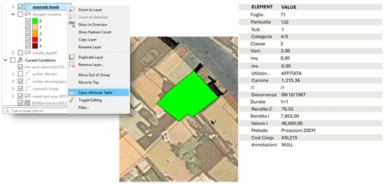 Figure 3). The contribution of these innovative functions makes it possible to optimize BIM-GIS integration, providing support both at the level of geographic maps and at the level of simplifying the search for different assets on the territory. Each asset is classified according to the aforementioned typologies, and is placed in the reference layer, which is distinguished by color. An MMQGIS script can be employed to automatically insert the available documentation of an asset into the table of its characteristics. Consequently, once the assets under discussion have been georeferenced, it is possible to enter all the necessary information with reference to the polygon.