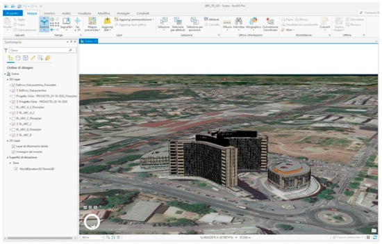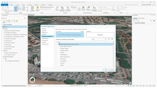 77]. Esri (the Environmental System Research Institute) is one of the leading producers of GIS software systems and applications for the management of geospatial databases. ArcGIS is a geographic information system that is employed for the creation, analysis, and technical use of maps, the compilation of geographic data, and the sharing and management of geographic information within a database. This phase encompasses the definition of the standardized coordinate system to be employed, the selection of the graphical display mode of the model and the background map, and, finally, the specification of the nomenclature for the Common Data Environment (CDE) repository to be followed and the final destination of the project file [