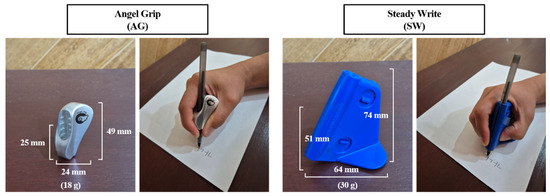 The act of holding a writing aid to write is one of the most delicate movements of the hand, and the interaction between the thumb and the rest of the fingers is very important. The dynamic tripod grip is widely used and recommended as it allows efficient movement of the tip of the writing aids in contact with the paper and minimizes muscle strain that can cause fatigue when writing [10]. Accordingly, in this study, we selected two widely utilized types of writing aids in rehabilitation settings to evaluate their impact on the biomechanical characteristics of handwriting in stroke patients. These aids, Angle Grip (AG) and Steady Write (SW), support the dynamic tripod grip, which is recognized as an optimal grip pattern for enhancing writing efficiency, minimizing muscle strain, and improving endurance. Both writing aids used in this study are designed to accommodate pencils that can be inserted and removed as needed. When inserted, the pencil is held securely in place to prevent any movement during use, ensuring stability and consistent writing performance. These writing aids differ in shape, size, weight, and writing angle, enabling a comparative analysis of their effects. Their accessibility and established use in rehabilitation settings further underscore their relevance to the study objectives. Figure 1 illustrates the grip methods of stroke patients when using two types of writing aids. The size of AG is 24 × 25 × 49 mm (width × length × height), and its weight is 18 g. AG (Angel Tech Co., Ltd., Daegu, Republic of Korea) is designed to be fixed to the thumb and grip surface, distributing the force to the back of the hand and maintaining a 60-degree angle when writing. The size of SW is 64 × 51 × 74 mm (width × length × height), and its weight is 30 g. SW (Maddak Inc., Wayne, NJ, USA) is designed with a wide triangular base shape to improve stability, maintaining a 55-degree angle when writing.