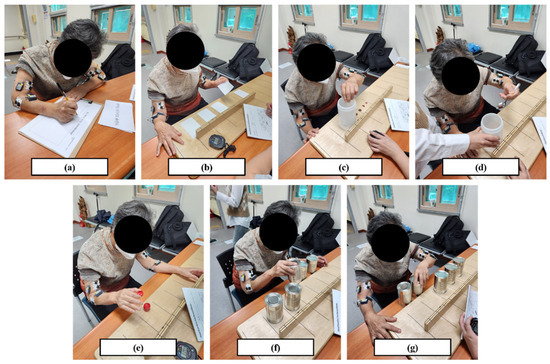 Jebsen–Taylor hand function test: (a) writing a short sentence (WSS); (b) card turning (CT); (c) picking up small objects (PUSO); (d) simulated feeding (SF); (e) stacking checkers (SC); (f) lifting lightweight objects (LLO); (g) lifting heavy objects (LHO).