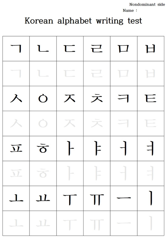 Writing ability was assessed using the Korean alphabet writing test (KAWT), with an inter-rater reliability of r = 0.95 and test–retest reliability of r = 0.65 [20]. The KAWT consists of the 14 basic consonants and 10 vowels of the Korean alphabet. The font size for Korean consonants and vowels was set to 48 points, and the squares were set to 2.5 cm × 2.5 cm (width × height). As shown in Figure 3, examples of letters are provided in the upper box, and letters with auxiliary lines for overwriting are provided in the lower box.