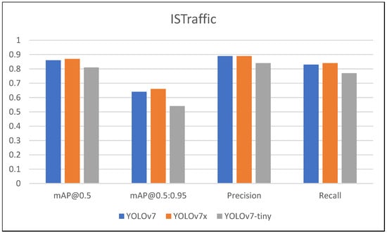 The evaluation of object detection models plays a pivotal role in assessing their real-world performance. In this study, we investigated three variants of the YOLOv7 model: YOLOv7, YOLOv7x, and YOLOv7-tiny, across two diverse datasets: “ISTraffic” and COCO. We evaluated the performance of the models based on mAP@0.5, mAP@0.5:0.95, precision, and recall metrics. Figure 4 demonstrates the results of the performance metrics.