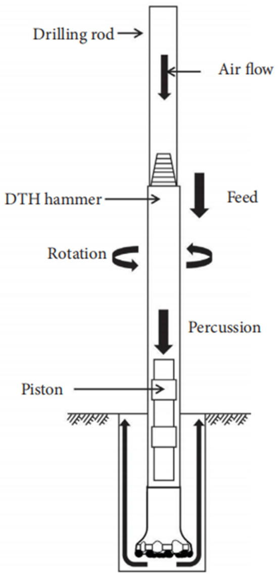 - Song, J.; Zhao, H.; Su, N.; Li, Q. Analysis of typical accidents and countermeasures for air DTH hammer drilling. Explor. Eng. (Geotech. Drill. Eng.) 2018, 45, 22–28. [Google Scholar]