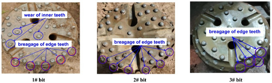 There is relatively serious wear of the inner ring buttons in the 1# bit, while only sporadic fracture is seen in the inner ring buttons of the 2# and 3# bits. Accordingly, the 1# bit has a relatively long lifespan with footage of 230 m, and the 2# and 3# bits have 46 m and 67 m, respectively. The reason for the long lifetime of the 1# bit can be explained by the fact that parts of the drilled formation are relatively weak (being of medium strength), which can make the inner ring buttons wear normally. The less cumulative footage of the 2# and 3# bits are mainly caused by the high strength of the drilled formation. The lifespan improvement of the 3# bit to the 2# bit is the result of the rotation speed from 60 to 30 rpm.