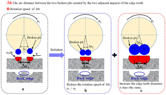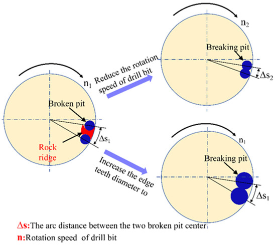 When drilling high-strength formations, large-diameter bits may encounter the problem of blade buttons breakage, which is usually caused by shear failure. When the drill speed is high, especially when the rotary table drill is used, and the impact frequency is low, the arc distance ∆S1 between the center of the two crushing pits formed by two impacts adjacent to the side buttons is large, see Figure 5a. This large arc distance may result in the rock not being broken up, forming a residual ridge. In the case of high rock strength, the residual rock ridge can not break away from the rock mass, so when the bit rotates, the edge buttons will produce a strong tangential reaction force, which may lead to the shear failure of the bit buttons.