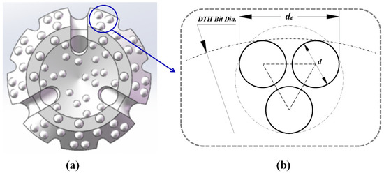 The process of DTH drilling is a transient dynamic crushing of brittle materials, and the cracks extend along the grain or joint of the rock. The edge buttons cluster arrangement is adopted, and the three ball buttons are as close as possible to meet the installation requirements. The rock between the ball buttons in the cluster is broken through crack propagation [31,32,33]. The equivalent diameter is
