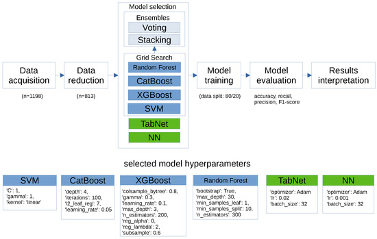The performance of the selected models relies on their hyperparameters. Therefore, optimizing them is crucial for improving model accuracy and generalization. For this study, it was decided to use a grid search to identify the optimal hyperparameters for the models. This systematic approach involves defining a grid of hyperparameter values and evaluating model performance across all possible combinations. Grid search optimization turned every positive result in other medical-related research, like the one focusing on predicting HIV/AIDS test results, improving prediction accuracy and robustness [26]. The mathematical simplicity of this approach is one of its advantages. The downside is that it requires certain knowledge of the models and their hyperparameters to create the list that helps to narrow the search. Model performance was assessed using accuracy as the scoring method. The hyperparameter combination providing the highest score was selected as the optimal configuration for each model. For different models, a different list of hyperparameters was defined. For the XGBoost, the optimized parameters were:
